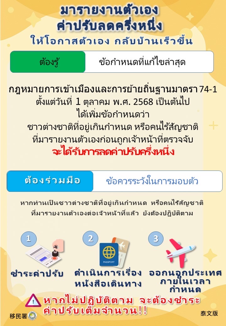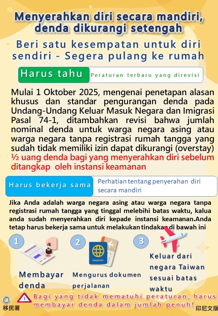 內政部日前公告修正「入出國及移民法第七十四條之一特殊事由之認定及減免處罰標準」第3條,自114年10月1日起推行全新外籍人流管理制度,凡是逾期停留或居留的臺灣地區的無戶籍國民及外國人,在查獲前自行到案者,罰鍰減半,目的在鼓勵逾期居留的人,勇敢向移民署等治安機關出面到案,給自己早日返國的機會。