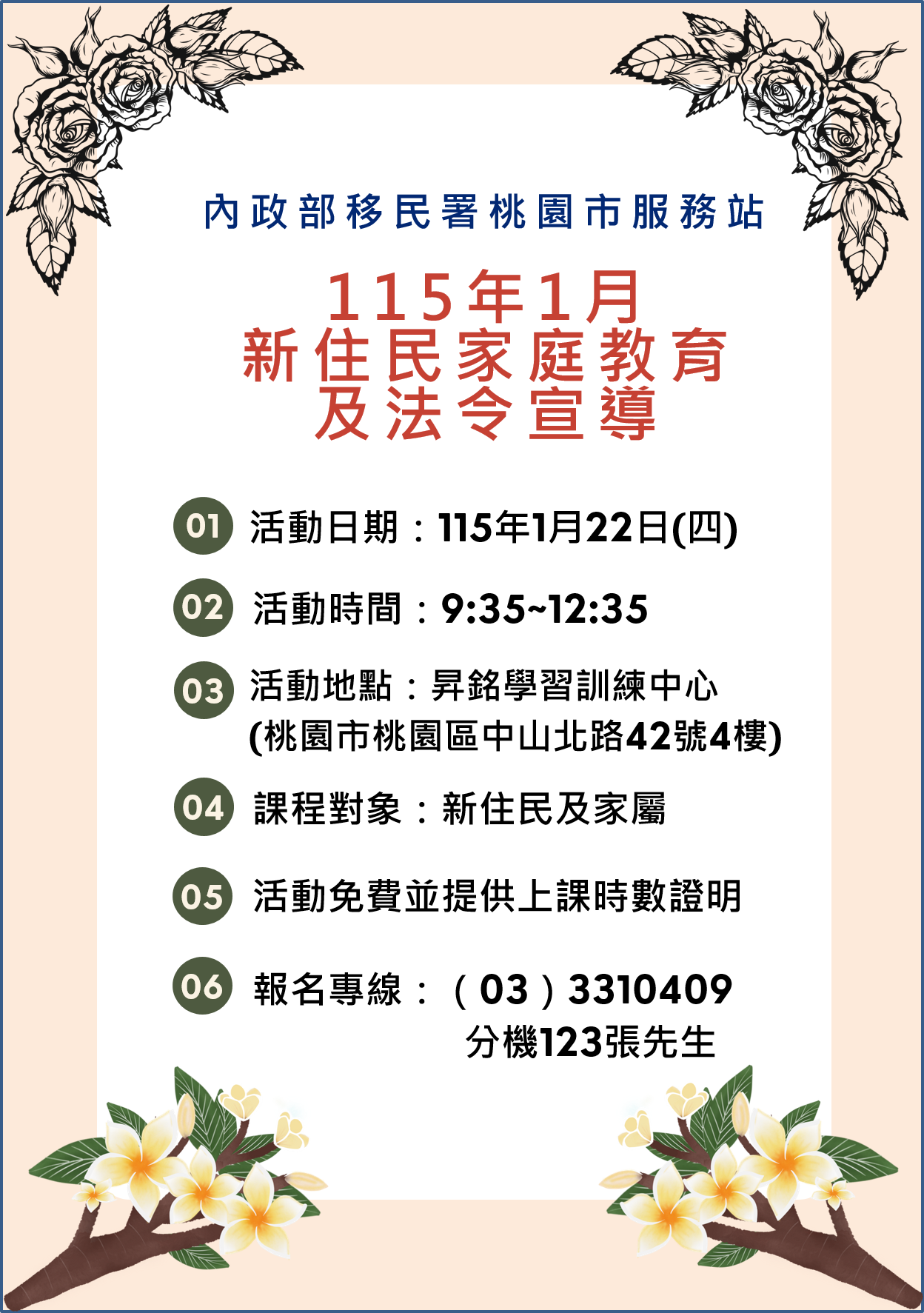 移民署桃園市服務站115年1月份行動服務列車及家庭教育活動資訊詳如附件,歡迎大家提前來電預約報名,多多利用。
